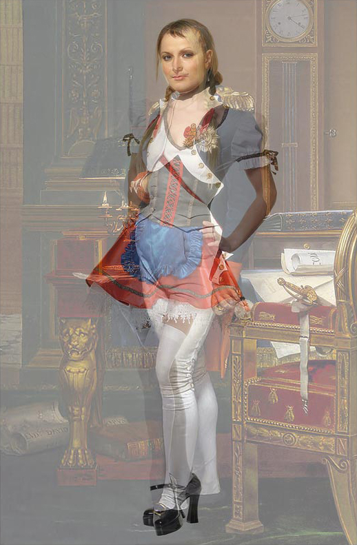 The images in her current body of work were initially borrowed from internet sites for sexy costume. Women in revealing pirate, soldier, and other outfits are posed in photographs that recall, in Oropallo’s words, “the formal portraiture male power stance with elaborate costume.” The artist deconstructs and enhances the images to investigate the seduction and power that are evoked by gesture and pose.