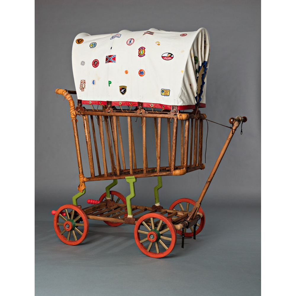 In order to communicate with the world outside their own minds, both Robinson and Brunson have created distinct visual languages unique unto themselves. Walter Robinson’s visual language is sculptural, highly political, stemming from his upbringing in a multi-lingual family that included a cryptographer during the Cold War era. Robinson assembles visual phrases through amalgamations of found and hand hewn objects. Often, he incorporates cryptic messages in his works, using either word cross tactics, or by juxtaposing objects in a manner that frames a new view. Robinson’s newest work, “Tumbril”, addresses current societal issues such as consumerism, expansionism, and Manifest Destiny. “Tumbril” is defined as “A farm dump cart for carrying dung; carts of this type were used to carry prisoners to the guillotine during the French Revolution.”