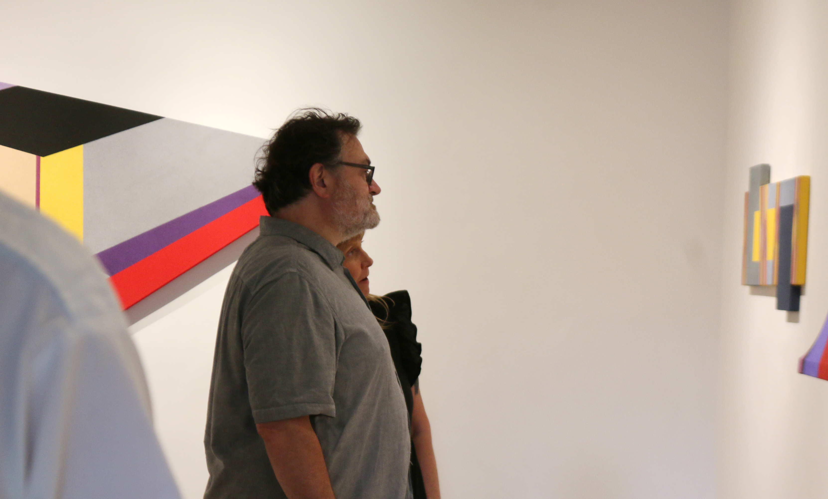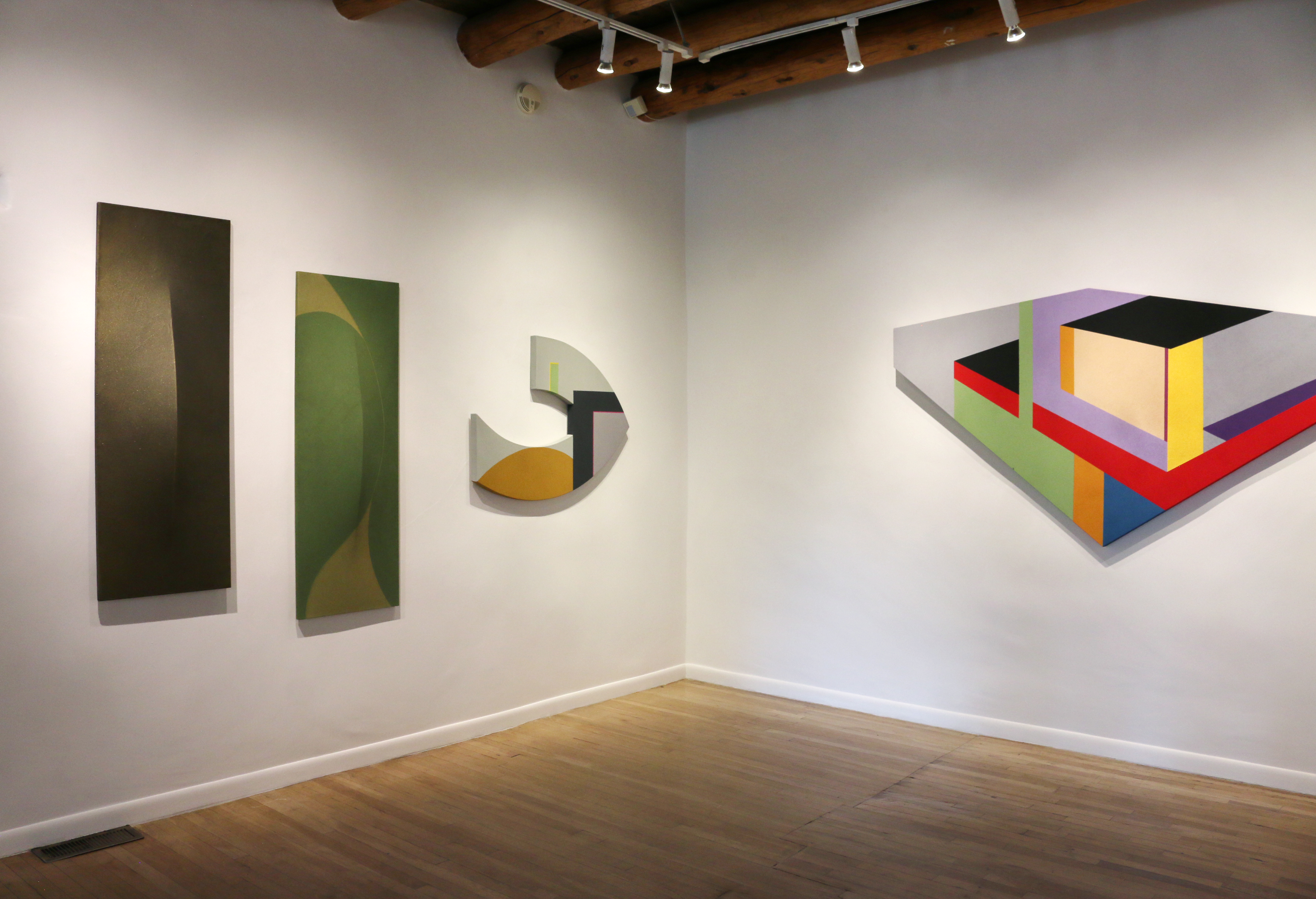 Perhaps it is the belief that reality is fluid that fuels Laget’s desire to challenge perceptions of form and color and to offer viewers a quasi-synesthetic experience. Her richly hued, shaped canvas Sidelight defies rational perceptibility by refusing to obey the traditional rectilinear picture plane. Eclipse #1’s external perimeter harmoniously coexists with contrasting interior shapes, whose colors are experienced as movement and dimensionality. In Optic Slide, colors recede and protrude, hover and tilt-activating the wall with architectural tension and optical play. Laget purposely alters perspective lines to engage the viewer’s own imagination and creative impulse. Measure for Measure introduces open, portal-like voids; while Laget’s Arc series pushes outward with sculptural insistence, creating a rhythm that is both formal and felt.