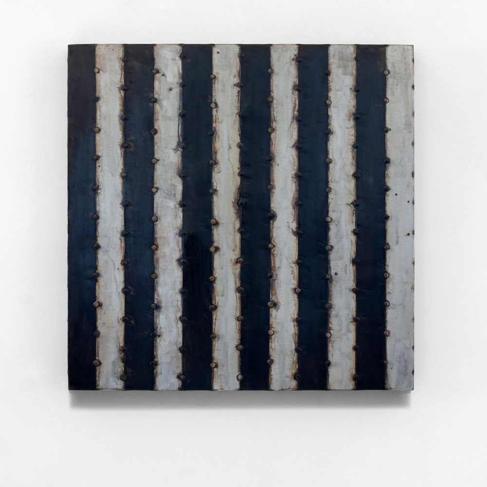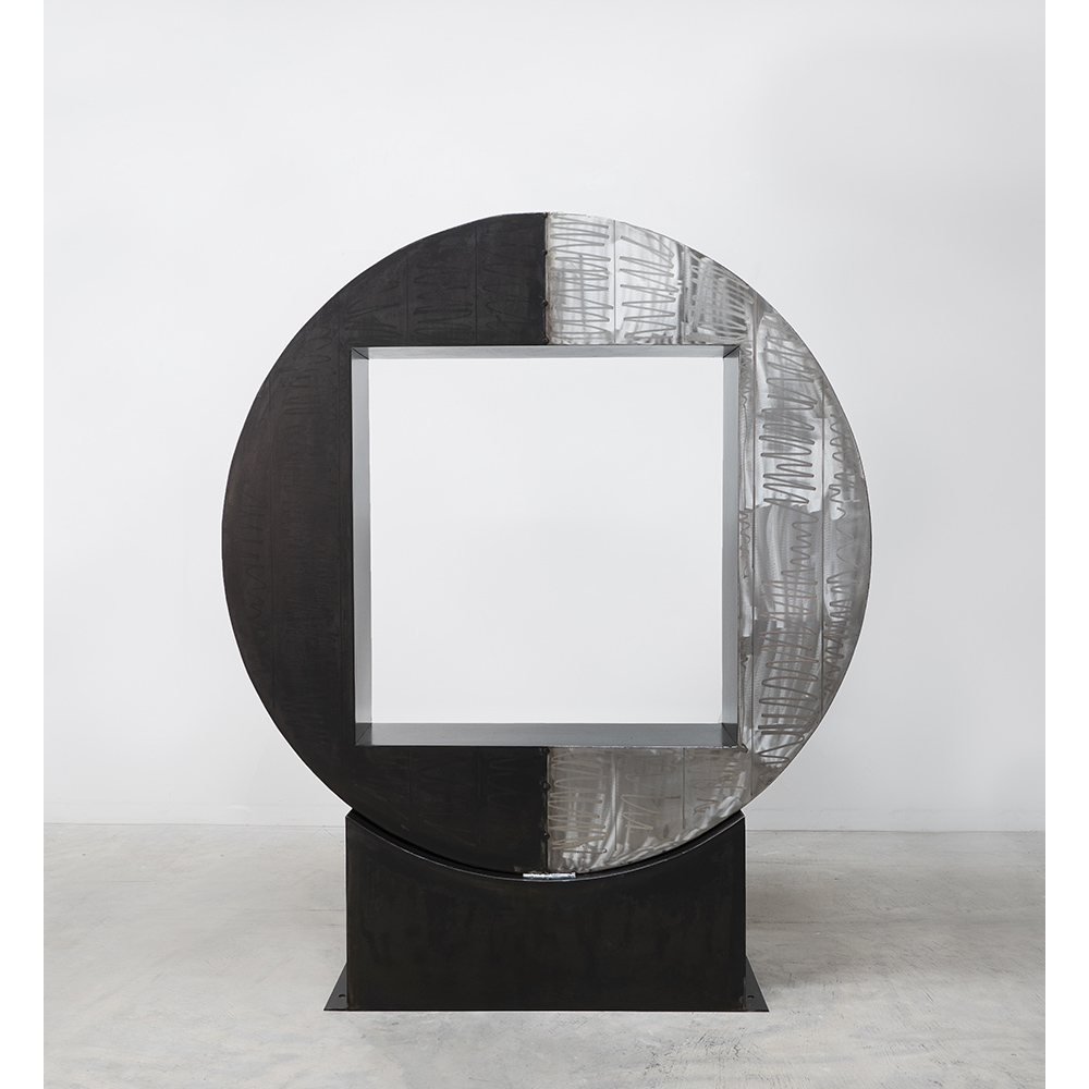 Karen Yank, Realization, stainless steel and blackened steel, 2024, 66 x 66 x 2″