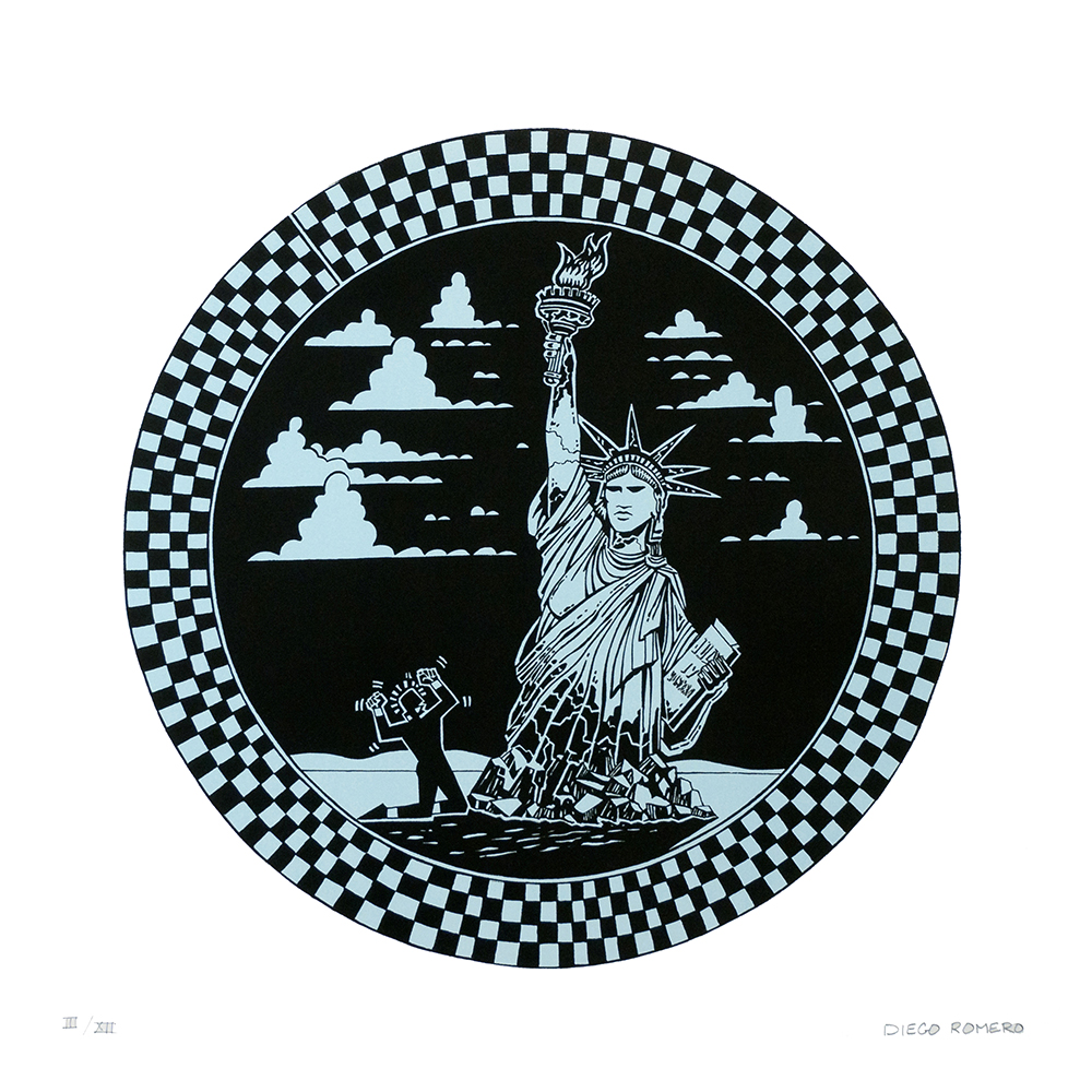 Although he is best known as a ceramic artist, Diego Romero works in a variety of media, including drawings and prints. Usually, the drawings are studies for his spectacular bowls, the form Romero most often employs to express his ideas. A range of influences have shaped Diego Romero’s graphic style – Mimbres and Greek ceramics and comic book art.