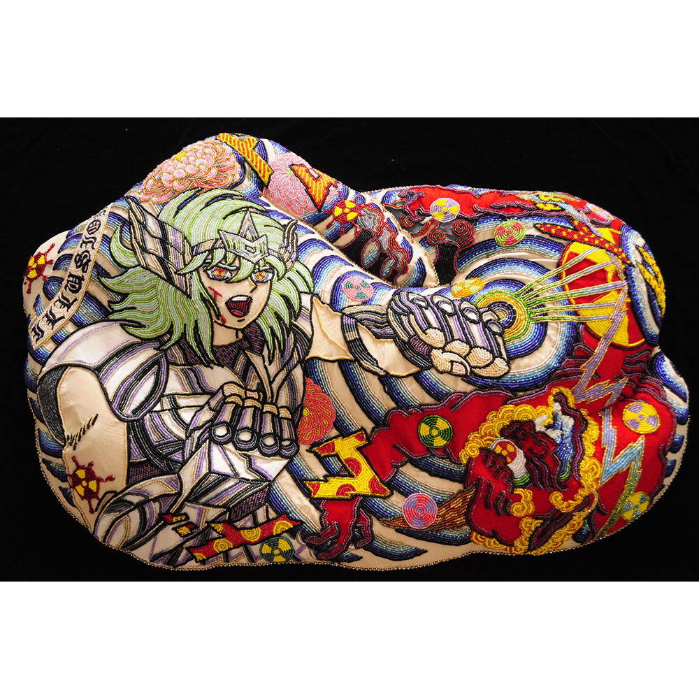 “In the piece Illusion I depict a tattooed male torso crouching and holding himself. There is a Manga hero version of himself wearing super powered protective gears. The Manga hero is saving humanity while simultaneously saving himself.” Eri Imamura