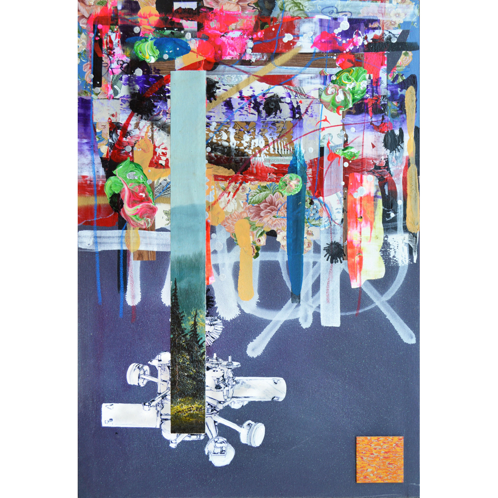 Medium: collage, acrylic, spray paint on canvas
