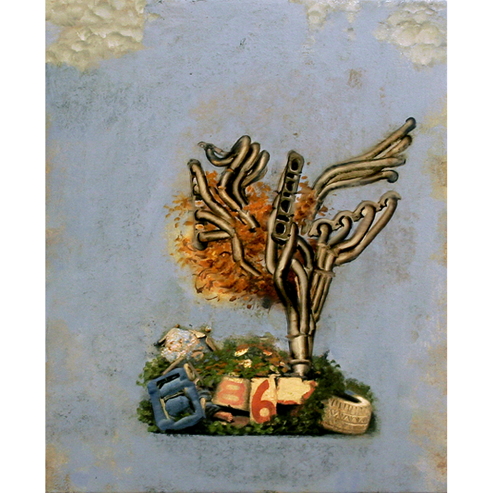Scott Greene’s oil on canvas on panel work, Garden Snag, shows an unconventional garden scene, where a metal tree—reminiscent of a deconstructed instrument—grows from a patch of grass interspersed by forgotten items and children’s blocks. Greene plays with the idea of childhood and temporal development within the work, where the presence of live material indicates a sense of growth and a movement away from the budding stages of early life. This growth is interrupted, however, by the plant’s man made qualities; the silver material prevents it from further changing and reaching maturation.