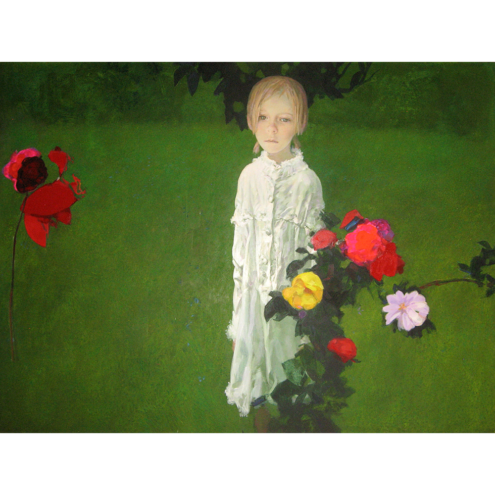 Melnikov’s Swimmer breaks with Melnikov’s traditional color palette, instead relying on the contrast between the saturated landscape and the stark whites of the central figure. The young girl bears an expression of ambivalence, which can be described as both contemplative or forlorn—at odds with the vibrancy of the flowers and lawns encompassing her. The work conveys Melnikov’s artistic versatility, employing a range of brush techniques, and which grant further contrast between the painterly and more delicate details.