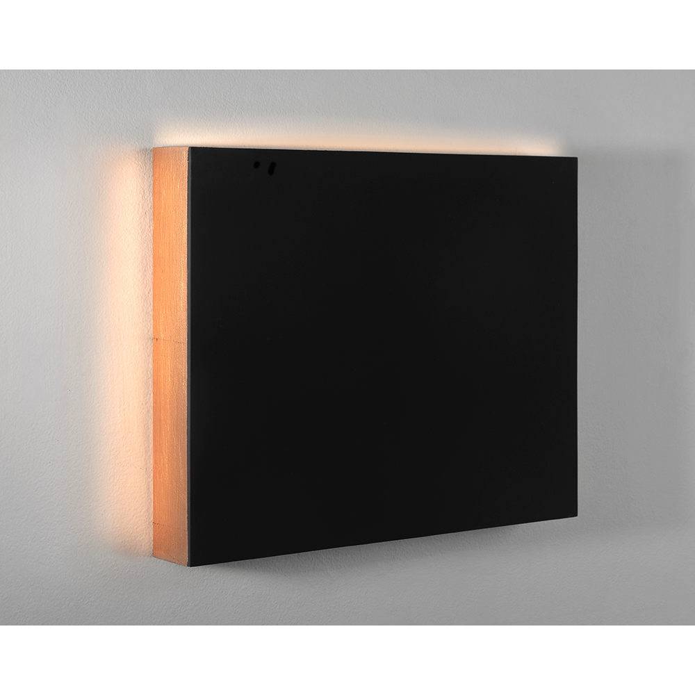 Eclipse is a series of paintings of Flashe© and copper leaf on panel and linen. The series came about from my infatuation with the idea of a black surface that would not reflect at all—an echoless environment. Black has been a thematic visitor in my work for a while. Mystery, fear, discovery, velvet, night etc.…all intrigue me I pursued this evasive black relentlessly for several weeks. After many trials I arrived at Flashe©, a black that one sinks into and doesn’t return, a black hole.