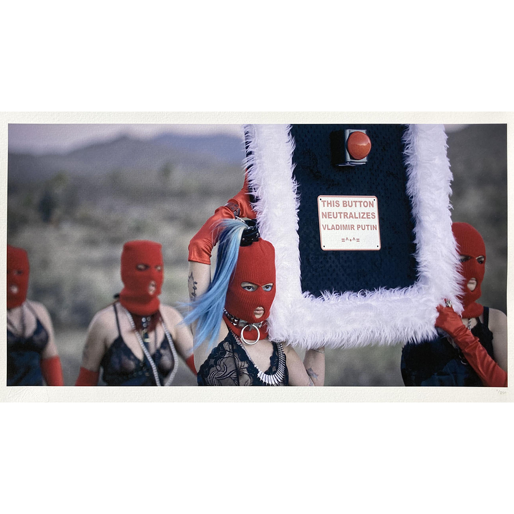 Nadya Tolokonnikova is known internationally as the founder of the Russian feminist activist group Pussy Riot. She has instigated some of the most significant actions of social justice against Russian tyranny, including Pussy Riot’s Punk Prayer in the Cathedral of Christ the Saviour in Moscow. Tolokonnikova was subsequently imprisoned in Siberia, where she was forced to sew Russian army uniforms. In true Tolokonnikova form, she used the sewing skills the regime forced her to learn against them, by creating her own anti-Putin artworks (such as this one) using these same skills. The resulting Putin’s Ashes artworks put Tolokonnikova on the international art world map as her first collectible museum and gallery artworks. They also earned her a Russian arrest warrant and a spot on Putin’s most wanted list. The art historical and political significance of these works is profound.