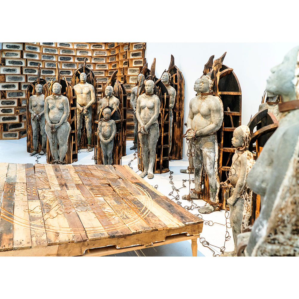 The sculpture exhibit, “Cash Crop,” depicts the horrors of the Trans-Atlantic slave trade and seeks to create a connection between human rights violations of the past and the present. Hayes’ goal for the exhibit was to create 15 life-size models to symbolize the 12.5 million Africans imported to the Americas from 1526 to 1867 during the Trans-Atlantic slave trade. “This body of work serves as a reflection of the past and a glimpse of our present,” Hayes said. “The rear of each model displays a map outline of the Brookes slave ship. The map outlines correspond to how slavery in the Americas was established maintained and provided economic wealth for Europeans. Through the mending of materials, this exhibition brings a new dynamic to the history of the slave trade for modern-day visitors. Cash Crop is not only about the transporting of people as commodities, but it is also about how America still benefits from outsourcing and sweatshop labor in developing countries.