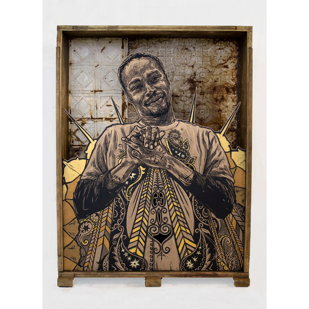 Swoon met George through the Mural Arts Philadelphia.. While George was initially particularly withdrawn, he and Swoon connected deeply over the experience of growing up with parents struggling with addiction. Over their time together, George came to open up about a profound psychological and physical wound he sustained when, at six years old, he lost the tips of his fingers while playing with dynamite. In this loving rendering of George, Swoon made the conscious decision to draw his hand front and center and illustrate the beauty and compassion in his face. In this way, she expresses, “I see you, and no matter what has happened to you, I see your wholeness and your perfection.”