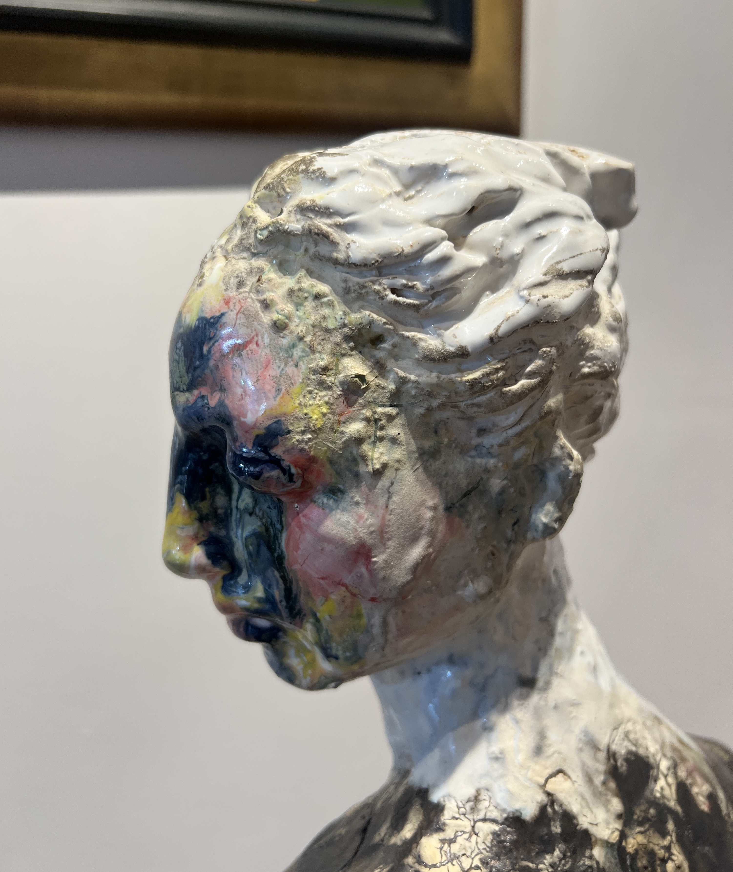 Wanxin Zhang’s work, The Waves, is an adaptation on the Greek sculptor Alexandros of Antioch’s Venus de Milo, which depicts the nude body of a female figure, her dignity upheld by an artfully draped fabric concealing her lower body. Zhang has appropriated the originally white marble work by covering her body in a black glaze, reminiscent of an oil spill or abject substance, and has replaced Antioch’s original head with one shown in profile. Through this, Zhang plays on the idea of copyright and reproducibility by depriving a canonical artist of his sense of ownership, simultaneously suggesting that work is often conceived by building on the past and what already exists.
