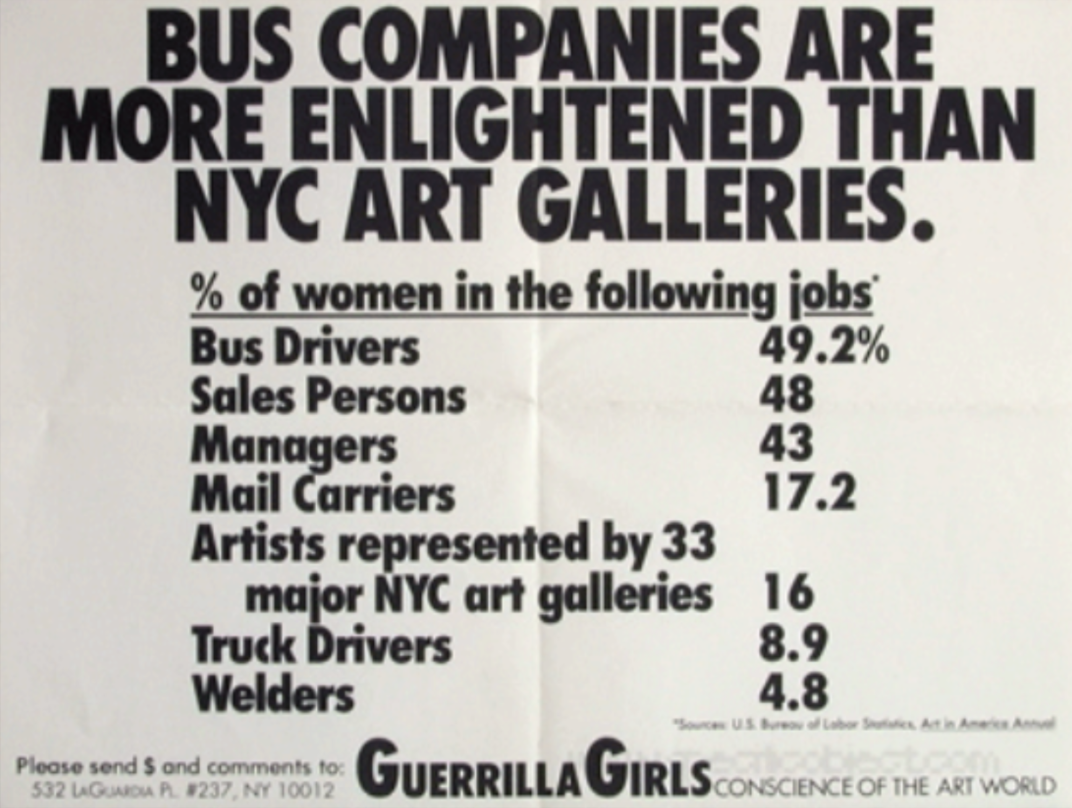 Since Nochlin’s essay, the art world has witnessed some incredible art by women, but statistics about the recognition of this work have improved only slightly. As the feminist art group Guerrilla Girls noted in 2002, women made up only 16% of the artists represented in major NYC galleries.