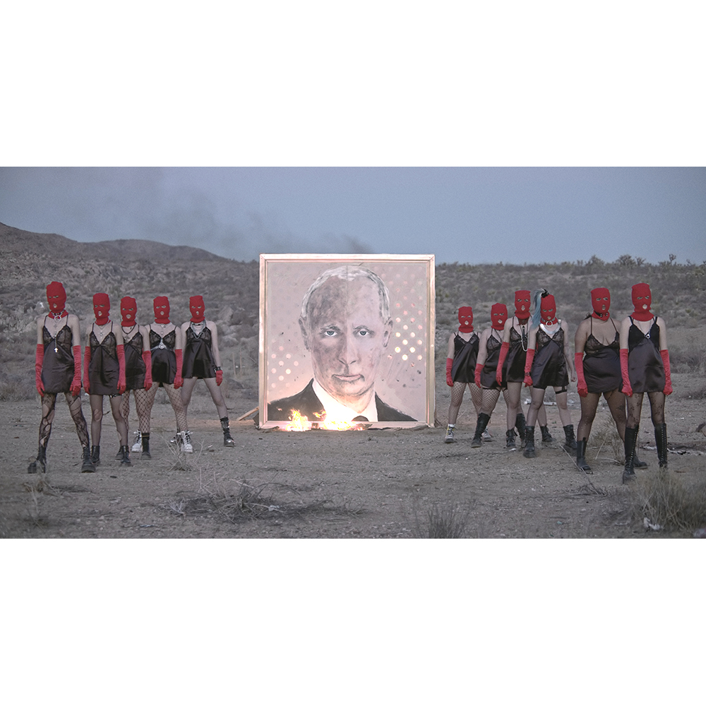 In 2022, Tolokonnikova staged a ritual in which she burned a large portrait of Vladimir Putin. She invited only Russian and Ukrainian women who professed profound hatred of Putin to participate to enforce the ritual’s power. Tolokonnikova and the participating women burned the physical image of the dictator and transformed him into ashes, which Tolokonnikova and the other participants scooped up into vials. The ashes, representing the destruction of the authoritarian ruler, were presented as artwork relics of the ritual. This enabled the ritual to expand its audience, as Putin’s Ashes artworks were added to permanent collections of museums including The Brooklyn Museum, The Ackland Museum of Art, and the Los Angeles Museum of Contemporary Art. Tolokonnikova’s Putin’s Ashes film was exhibited at Dallas Contemporary, OK Linz Museum in Austria, Indiana State University Museum of Art, Deitch Projects, and [CONTAINER] Santa Fe. Tolokonnikova’s ritual thus incorporated participants across the globe.