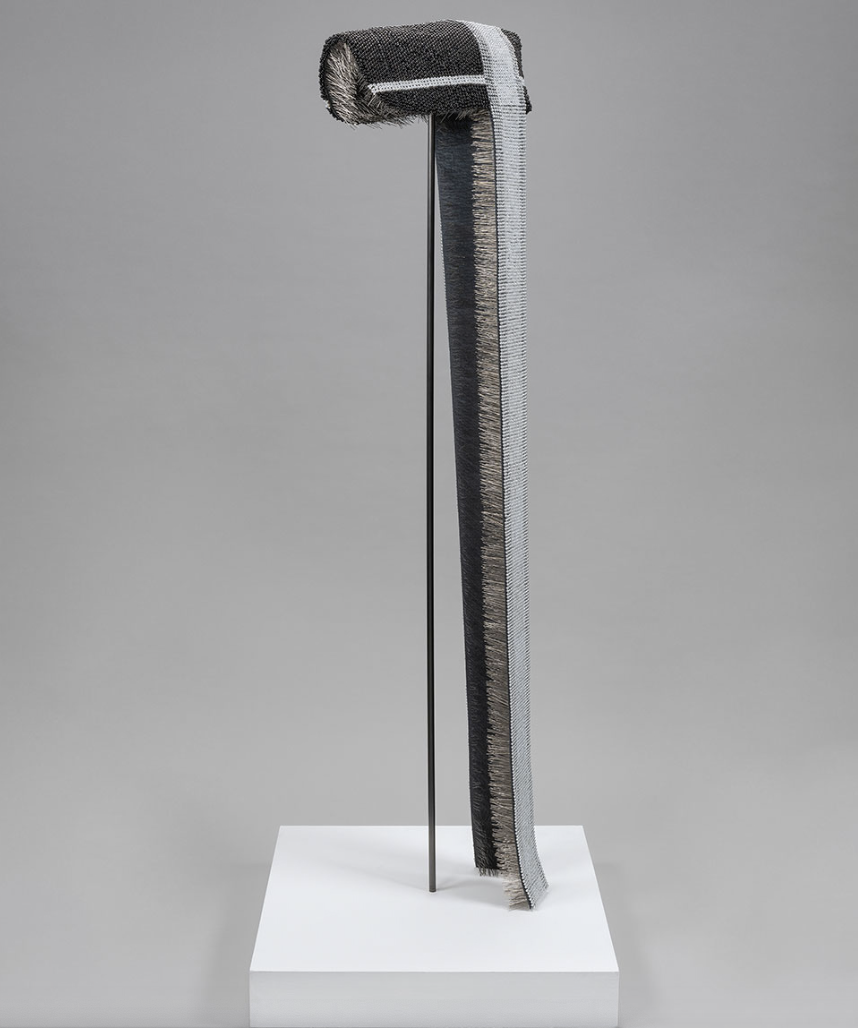 Tolokonnikova refers to works shown here, as her Dark Matter series. She premiered Dark Matter at the OK Linz Museum in Austria in 2024, as “amulets of hope” for a brighter future. In these works, Tolokonnikova combines the color black, sacred birch wood, images of her own body, as well as symbols and calligraphy she adapts from Slavic religious texts to conjure a brighter future.
